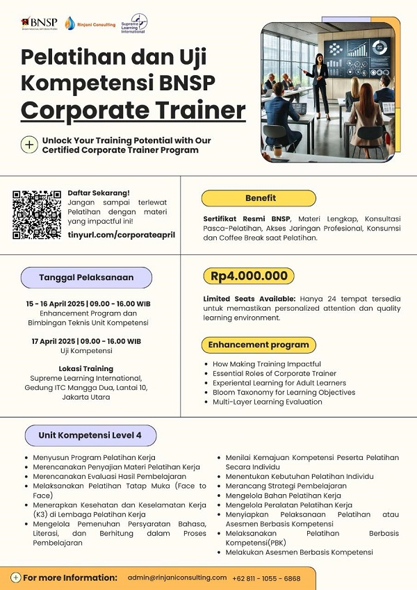 Pelatihan dan Uji Kompetensi BNSP Corporate Trainer I Rinjani Consulting I Supreme Learning International 2025