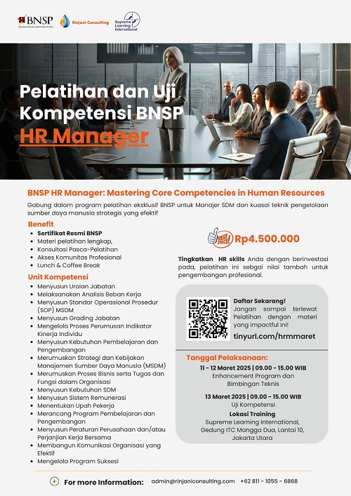 Pelatihan dan Uji Kompetensi BNSP HR Manager I SLI 11 - 13 Maret 2025 I 09.00 - 15.00 WIB